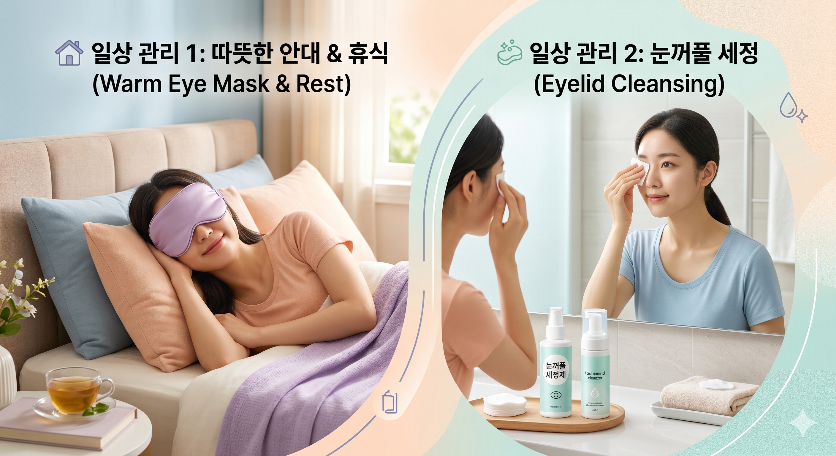 1. 온찜질: 하루 10분, 따뜻한 수건으로 눈을 찜질해 기름을 녹여주세요.