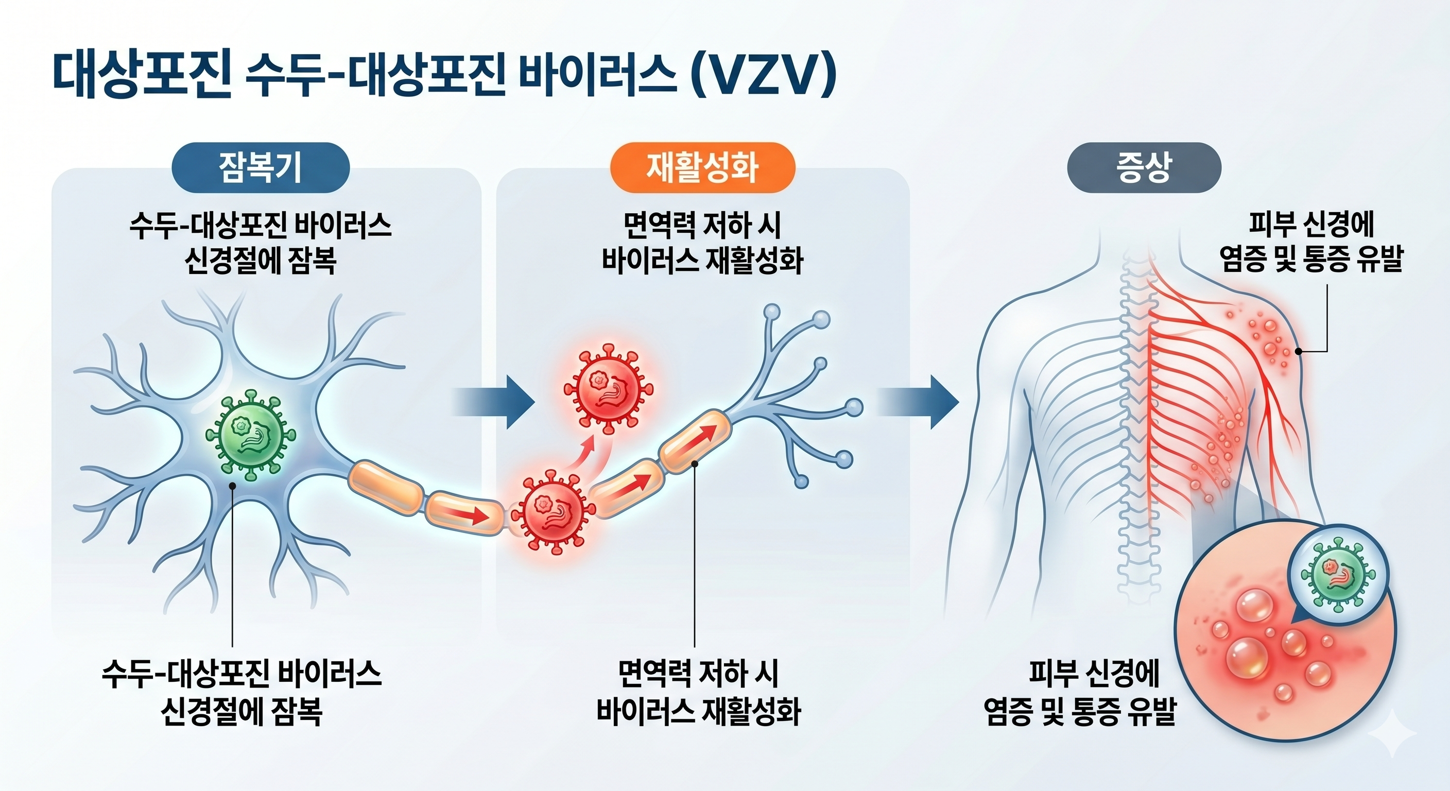 대상포진은 과거에 앓았던 수두 바이러스가 사라지지 않고 우리 몸속 신경절에 숨어 있다가, 면역력이 급격히 떨어지는 순간 다시 활동을 시작하며 발생하는 질환입니다.
